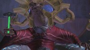 Inside the temple, a large contingent of Sangheili Honor Guardsmen and Unggoy defended the Prophet. Cortana detected a wave of Phantoms too large to measure en-route to the temple, indicating to the Spartan time was running short. John-117 was able to board the Regret's gravity throne and dispatch the frail San'Shyuum with his fist. The Prophet's guards quickly began to empty the temple, and Cortana detected the incoming Phantoms changing course, heading away from the temple. Shortly thereafter, Solemn Penance positioned itself over the main temple, and fired upon the structure with its energy projector at the order of the Prophet of Truth.[15] With not enough time for airborne evac, John leapt into the lake to evade the glassing beam. Here, he was soon grasped by the tentacles of the Gravemind, a Flood compound intelligence, and taken prisoner.[13]
