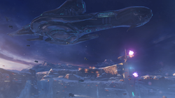 After the Covenant triggered the Forerunner site's defensive mechanisms, the Prometheans in Jul 'Mdama's army turned on their former-masters, now serving Cortana and the Created.[2] When UNSC Infinity and her battle group exited slipspace in the Caspar system some time between October 17-23,[Note 1] they found the Covenant and Prometheans already in the midst of a pitched battle. Infinity took advantage of the chaos by beginning the planned Operation: DESINENCE, deploying Fireteam Osiris, a Spartan-IV special operations squad, to retrieve Halsey and assassinate Jul 'Mdama if possible. They were dropped from low orbit via D79H Pelican and landed amidst an enormous naval and ground battle between the Covenant and Prometheans. Jul 'Mdama's Covenant made little headway, with the constructs managing to bring down a Hekar Taa-pattern blockade runner and force a Kraken walker to back off. The chaos from the Prometheans' rebellion provided Osiris cover from 'Mdama's Covenant, allowing them to sneak to the temple where 'Mdama and Halsey were stationed.[1]