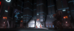 Within the ONI compound, the Marines and the NMPD forces destroyed the bridge leading to the base, in hopes of slowing down the advancing Covenant forces. This did not, however, stop the incoming dropships, but slowed the advance. The human forces fell back to the base's courtyard, which they defended against waves of Covenant attackers, before falling back into the interior of the main building. Again, they fended off multiple waves of Covenant. NMPD forces then planted explosives inside the complex, to destroy it in order to prevent the Covenant from accessing the Superintendent's data facility deep under the building. The only survivors of the siege were two ODSTs from Alpha-Nine, Michael Crespo and Taylor Miles, who evacuated from the roof, where they were picked up by an NMPD Pelican dropship. Once on board, they detonated the explosives and watched as the ONI building was completely destroyed. Six hours later, the building was still burning from the explosions.[17] At the time, Crespo and Miles were unaware that destroying the building had alerted a newly-constructed Yanme'e hive beneath the building in the Superintendent's data facility, making it much more difficult for UNSC forces to reach the data core later on.[41]
