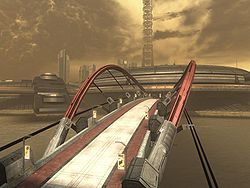 Bridges constructed by humans most often superficially similar to ones built using conventional engineering methods, although some are rather impressive in scale; an example of this is New Mombasa 105 East's enormous suspension bridge connecting Old Mombasa to New Mombasa.[11] The UNSC military also uses deployable bridges to make terrain traversable in combat zones and temporary military bases.[12]