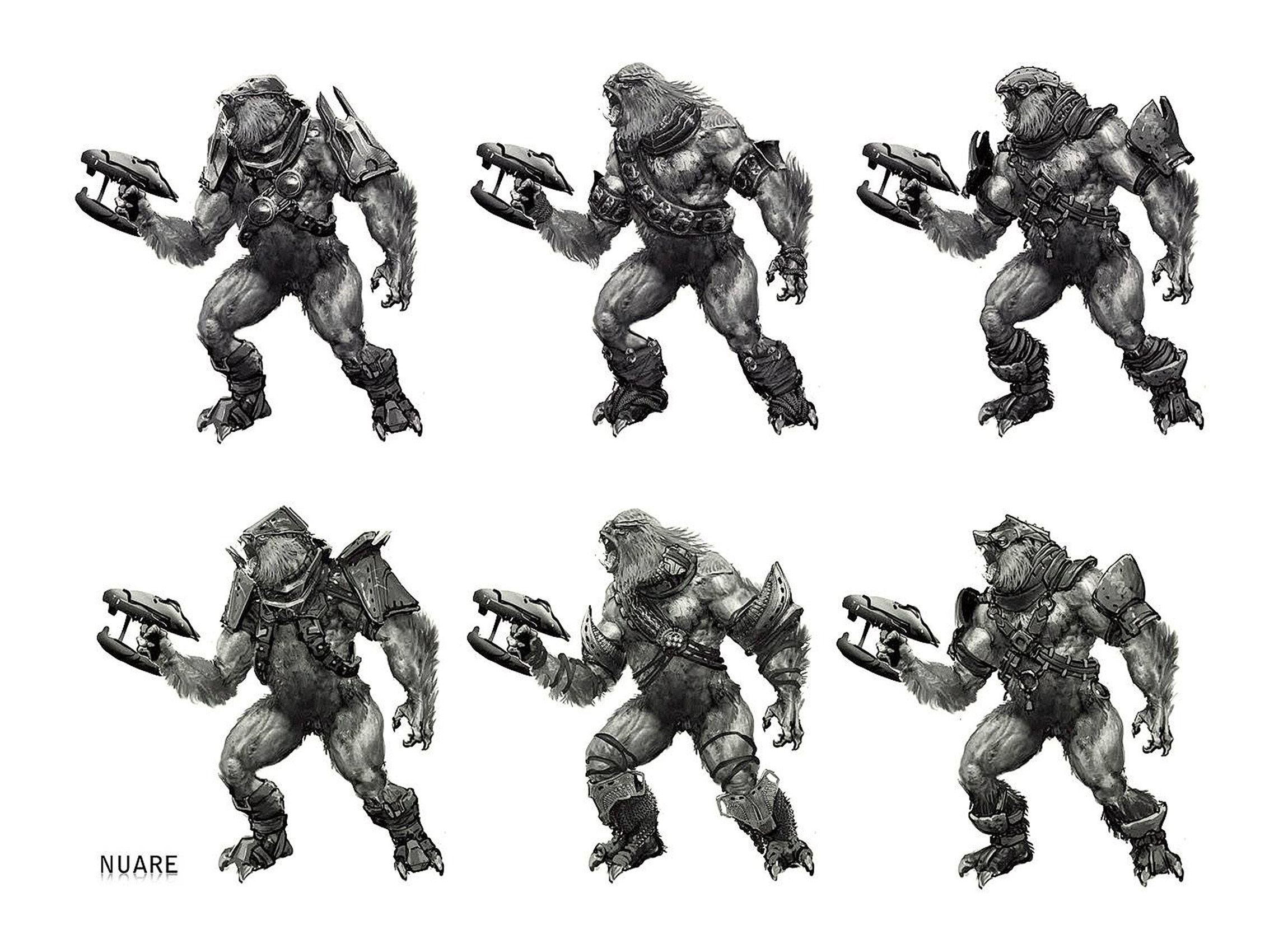 Jiralhanae are a carnivorous, sapient species of mammals[2] who share physical characteristics with Earth's gorillas, rhinoceros, and bears; due to their bear-like features, they are designated pseudo-ursines.[3] They have thick skin that ranges in color from dark grey to dark and light brown and makes them highly resistant to harm,[7] and their bodies are covered with matted tan,[22] grey,[12] white, brown,[43] rust-red[44] or black fur.[3] Some Jiralhanae, such as those of the Vheiloth skein, shave their fur,[45] with higher-ranking individuals sporting beards or mohawks.[43] Pale fur and skin are considered extremely rare.[17]
