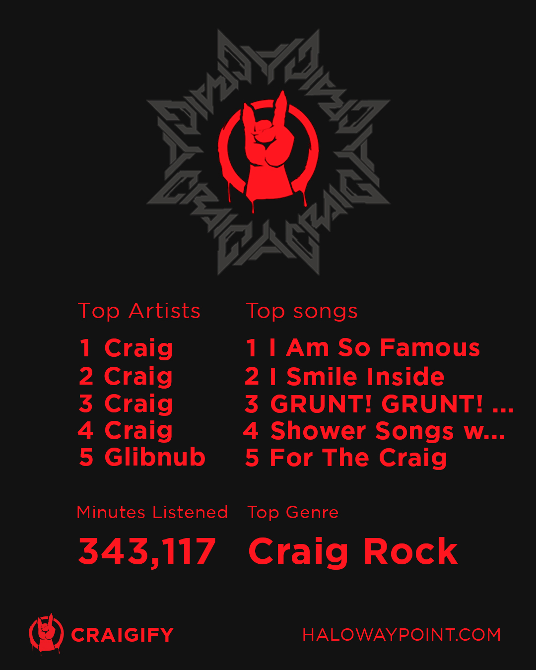 | Summary | A parody of Spotify Wrapped with references to Craig and his music. |