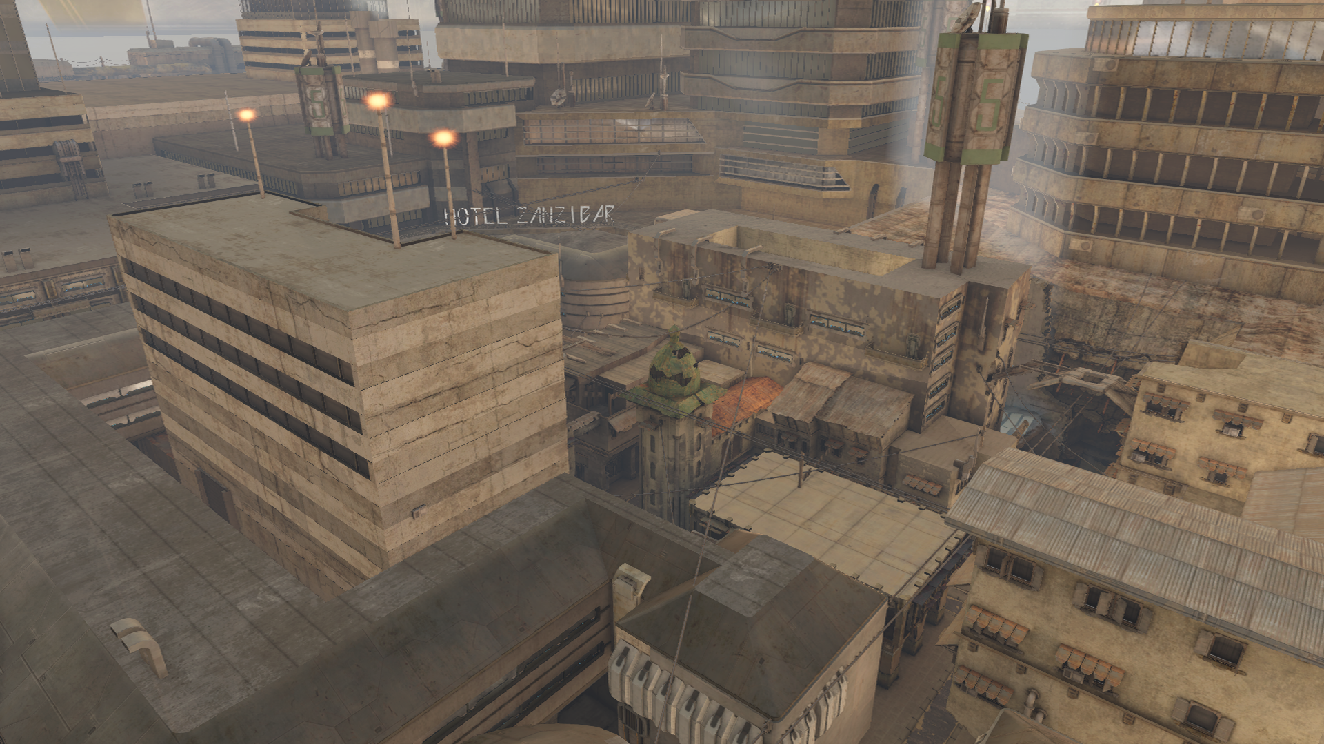 An aerial view of buildings in front of Hotel Zanzibar in Old Mombasa as seen in the Halo 2: Anniversary version of Outskirts.