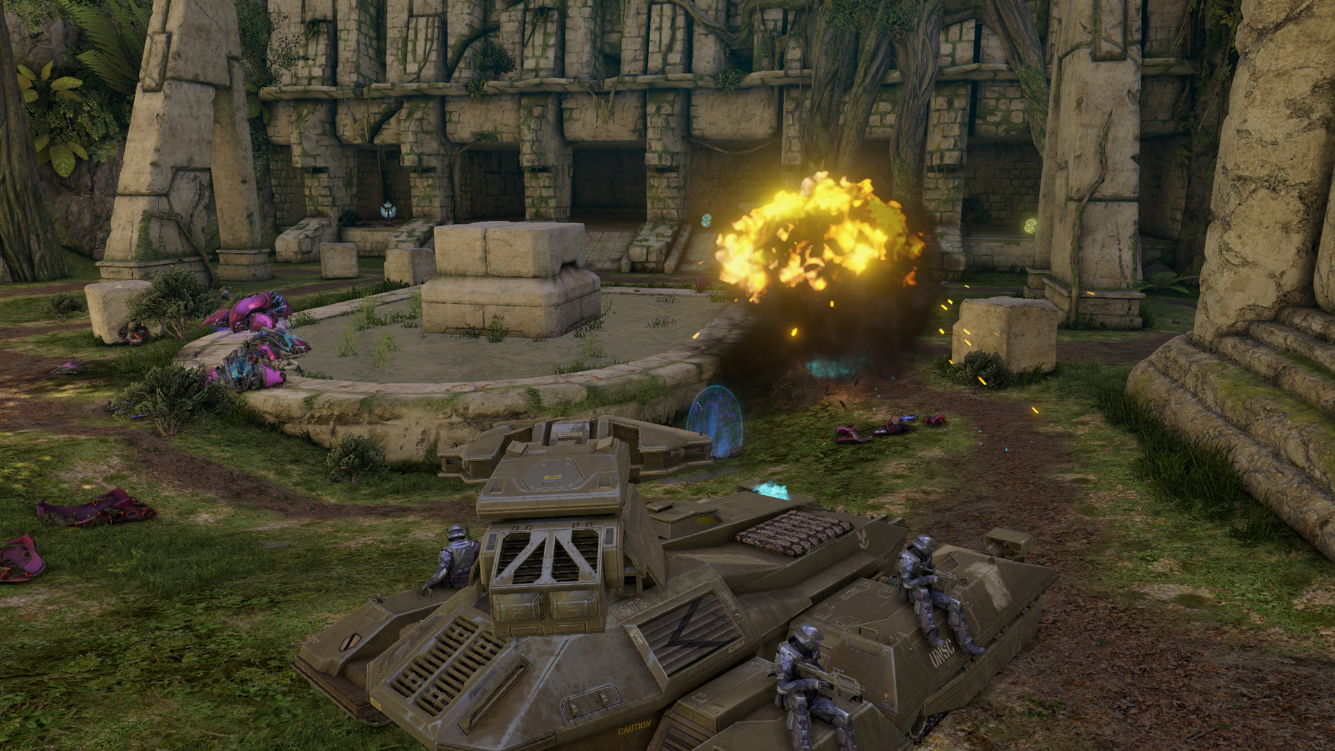 | Summary | John-117 engaging Covenant forces on the surface of Installation 05 using a M808B Scorpion tank. From Halo 2: Anniversary, campaign level, Delta Halo. |