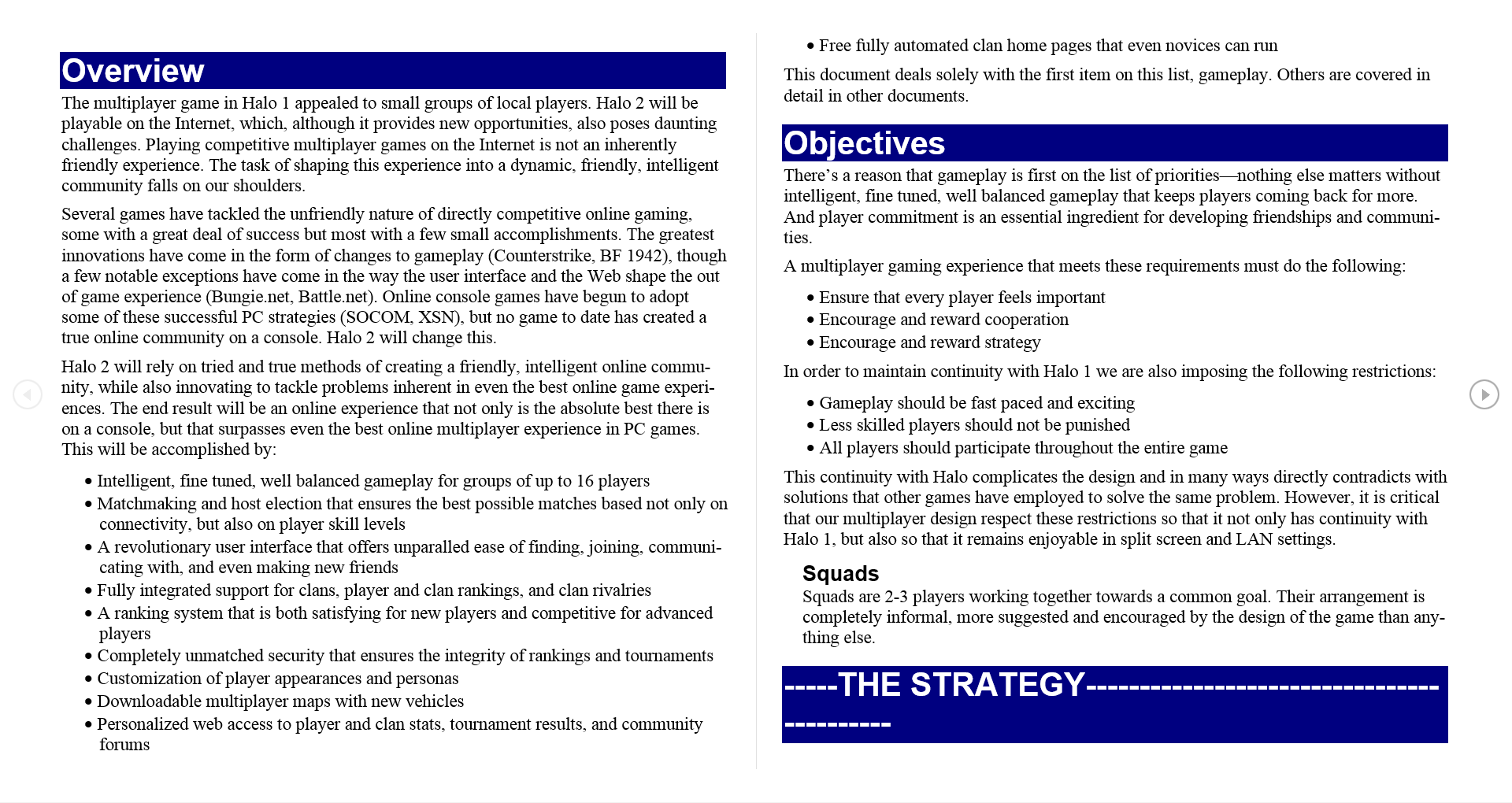 | Summary | Multiplayer design documentation for Halo 2. I've been sharing tidbits from my original Halo 2 multiplayer, UI, and online specs, but here's a real treat: an entire design doc. I wasn't initially in charge of the larger scale mp game, so I had to play catch-up. This was my plan.
