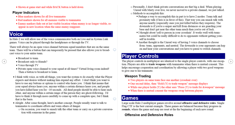 | Summary | Multiplayer design documentation for Halo 2. This was a living design doc, which I would share regularly inside of Bungie for feedback. This was last updated in November of 2003. Note that I used red to indicate features not yet implemented.