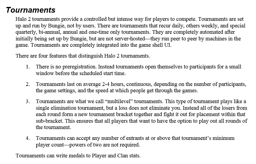 | Summary | Tournament design documentation for Halo 2. Yesterday I shared a link to the patent that Microsoft filed for the tournament system that I designed for Halo 2 (which unfortunately got cut). Here's a very high level blurb that I wrote early on summarizing the plan for tournaments for the Xbox Live team.