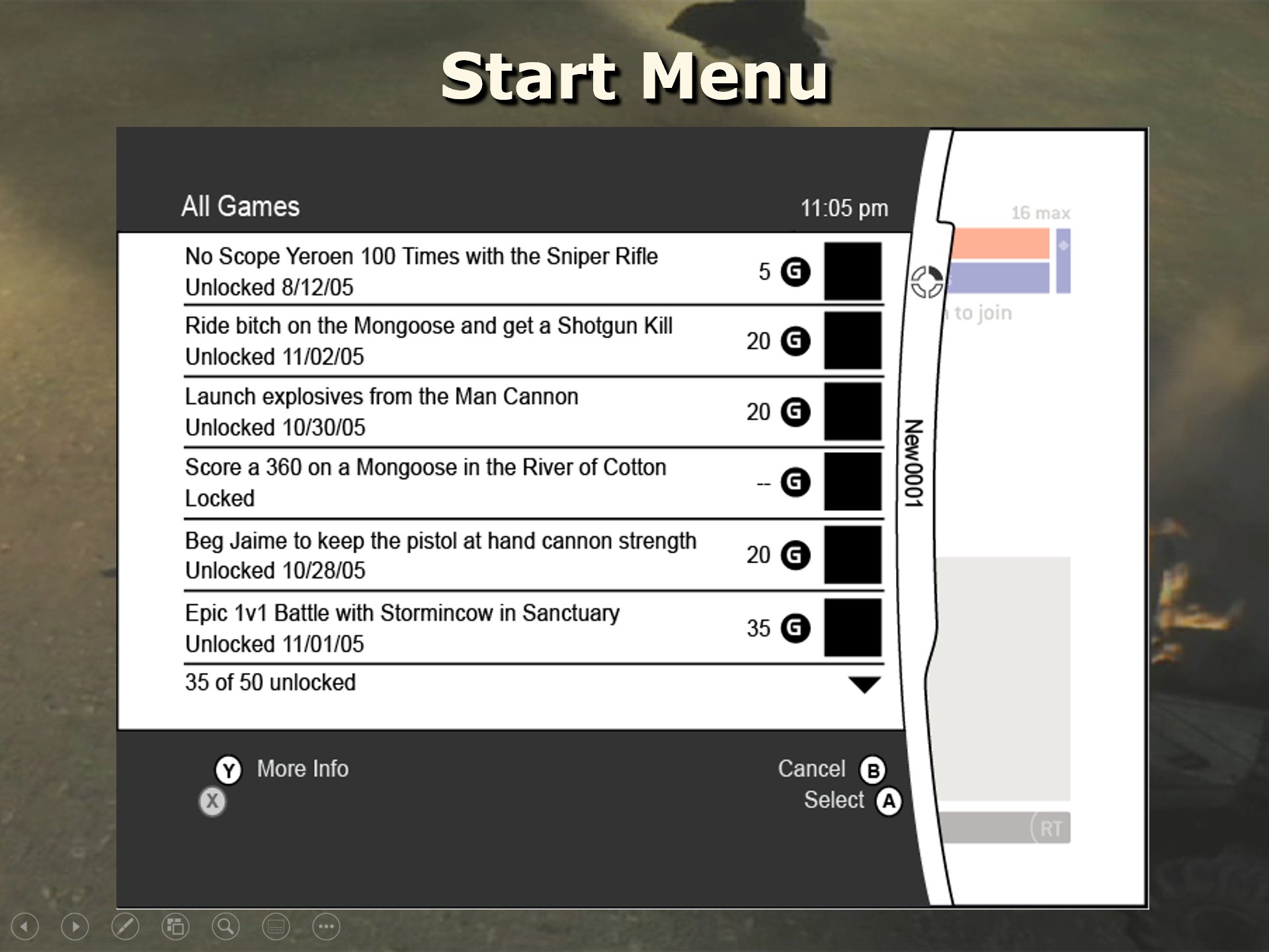 | Summary | Halo 3 late pre-production documentation about achievements. "Here's another fun tidbit from my old Halo multiplayer design docs. This is from a presentation that I gave at the end of preproduction on Halo 3, a slide talking about Achievements." |