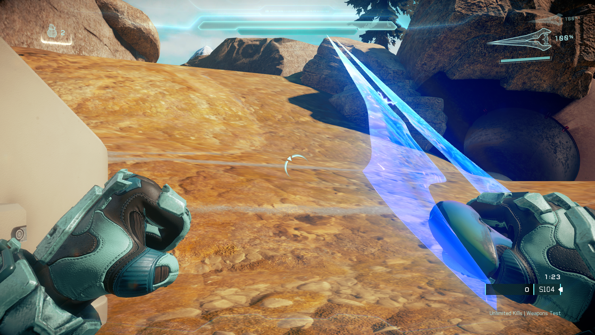 This image is a screenshot of a weapon from the Halo series of first-person shooter video games developed by Bungie Studios or 343 Industries and published by Microsoft. It falls under the screenshot category for a copyrighted computer game or video game, and the copyright for it is most likely held by the company that developed the game. It is believed that the use of a limited number of web-resolution screenshots: