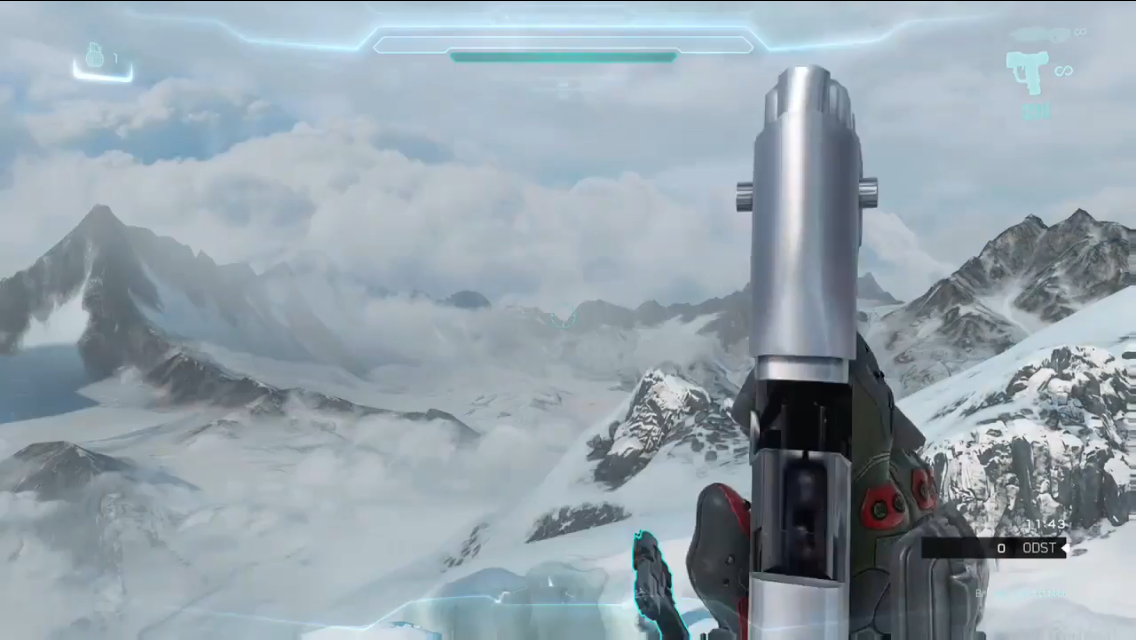 First-person view of a Spartan working the slide of an M6D in Halo 5: Guardians multiplayer.
