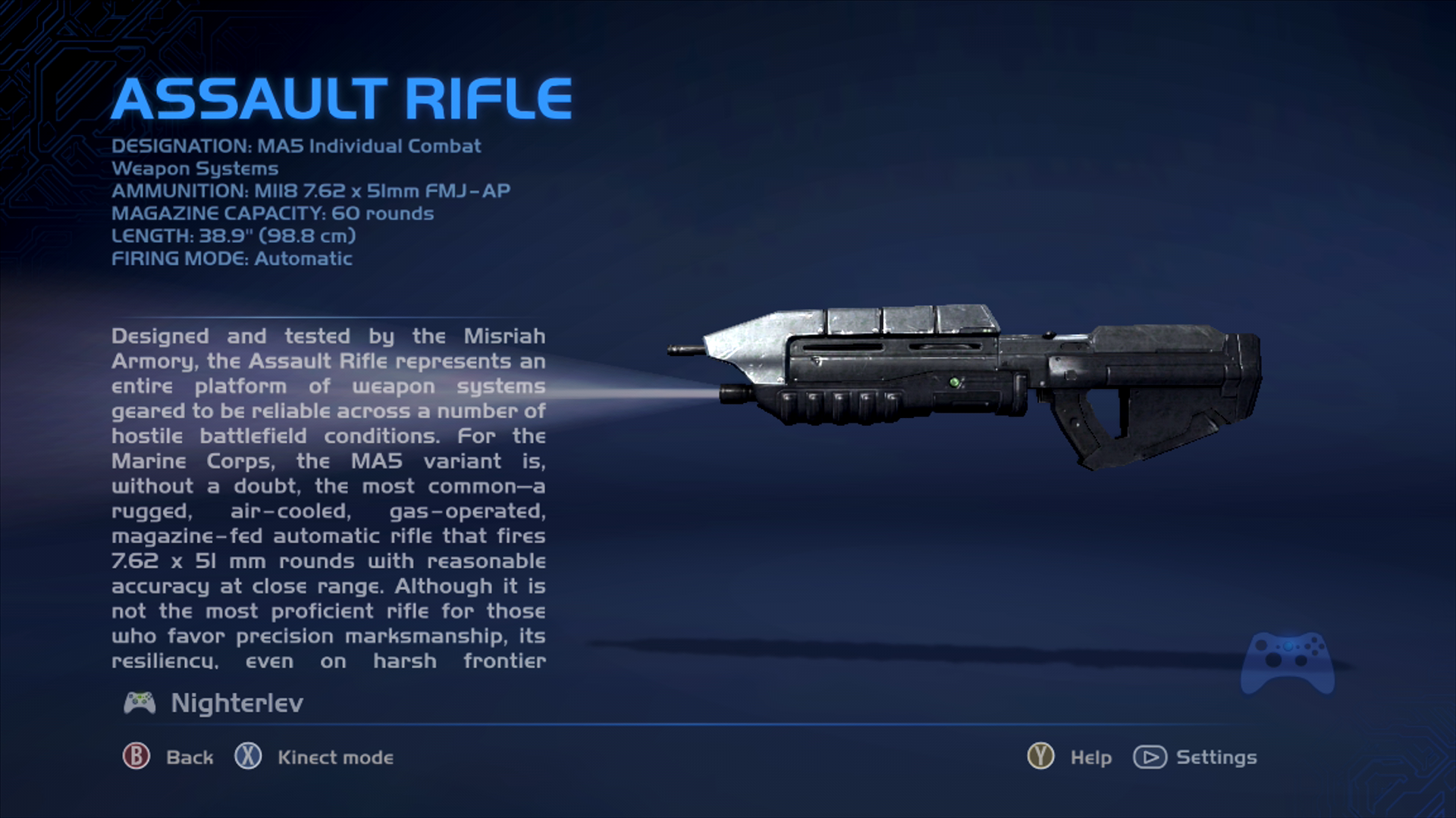 | current | 11:08, August 26, 2024 | 1,920 × 1,080 (1.41 MB) | Nighterlev (talk | contribs) | {{file info |summary = Assault Rifle from the HCEA Library. |game = Halo: Combat Evolved Anniversary |type = screenshot |subject = character |source = self }} Category:Halo: Combat Evolved Anniversary Library |