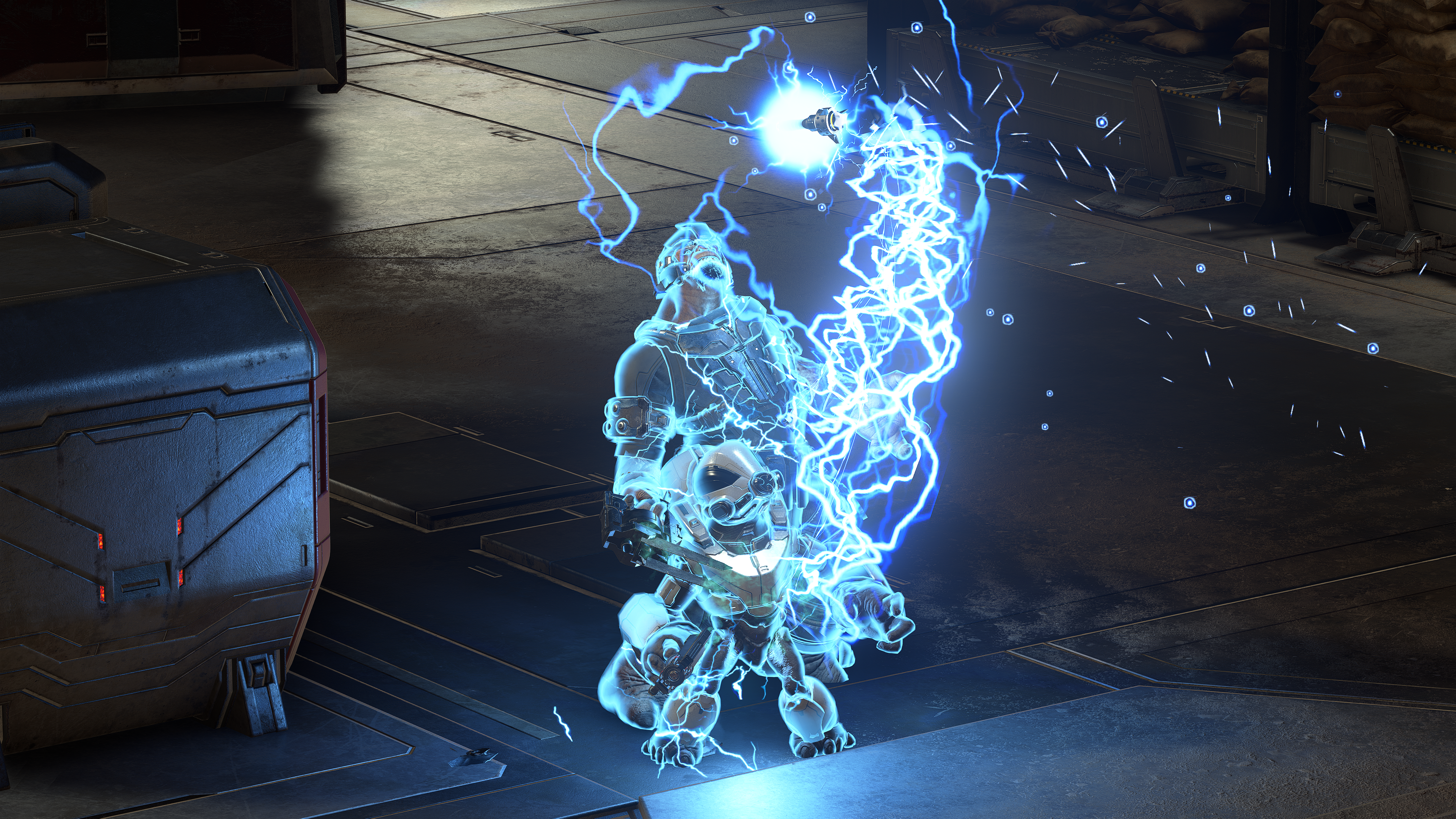 | Summary | An Unggoy Ultra and a Jiralhanae Warrior immobilized by a Sicatt Workshop dynamo grenade's electrical surge during a match of Firefight: King of the Hill on the Halo Infinite map House of Reckoning. |
