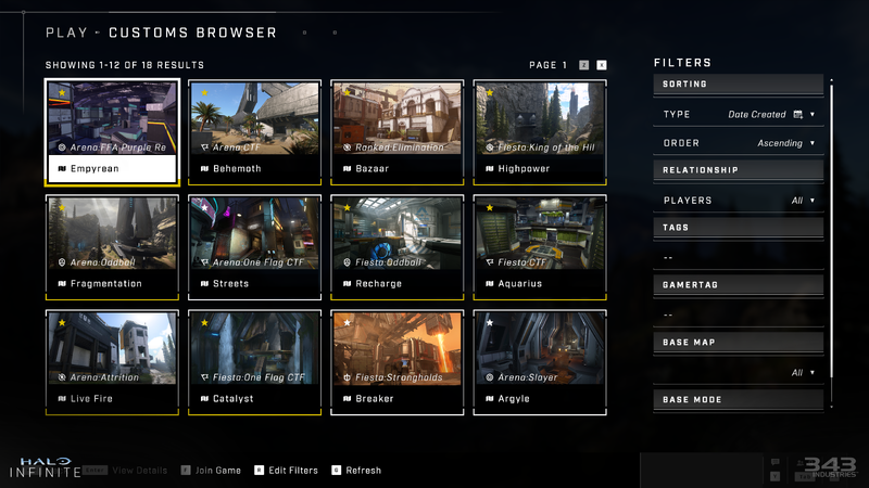 | current | 09:54, April 8, 2026 | 3,840 × 2,160 (4.38 MB) | JackVibe (talk | contribs) | {{Press kit|Winter Update}} {{file info |summary = Main menu for the Customs Browser. |game = Halo Infinite |type = screenshot |subject = menu |source = self }} Category:Images of Empyrean Category:Images of Behemoth Category:Images of Bazaar Category:Images of Highpower Category:Images of Fragmentation Category:Images of Streets Category:Images of Recharge Category:Images of Aquarius Category:Images of Live Fire Category:Images of Catalyst [[Catego... |