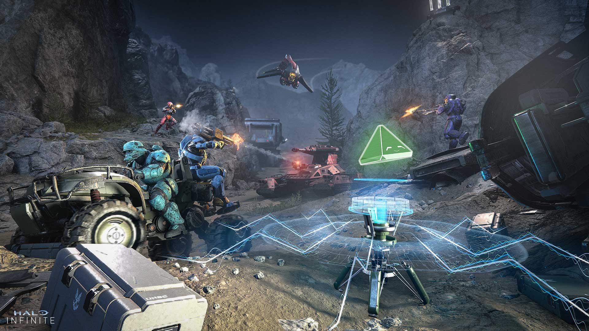 | Source caption | A chaotic screenshot from Big Team Battle with an Extraction zone, two Spartans on a Mongoose, and a Banshee flying overhead. |