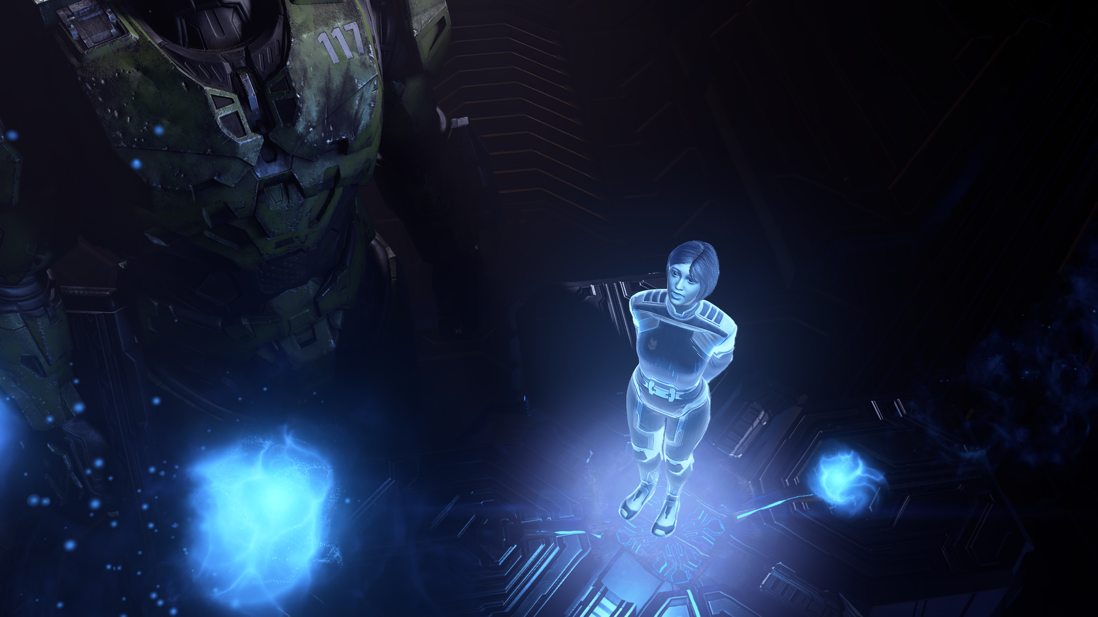 | Summary | John-117 and the Weapon looking at a residue data in the Silent Auditorium. From Halo Infinite campaign level Silent Auditorium. |