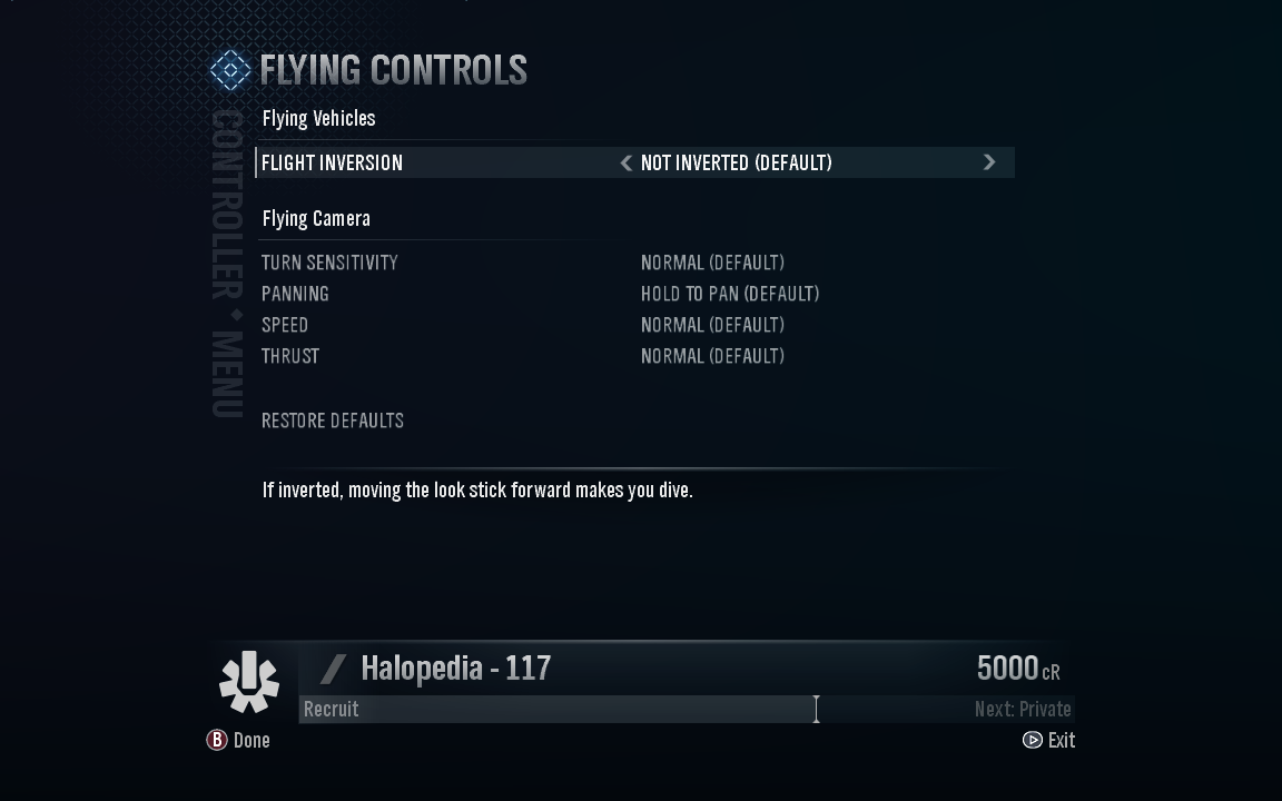 | Summary | A screenshot of "Flying Controls" in the Halo: Reach settings menu. Behind the game pause menu is pitch black. Note: The screenshot was taken from the emulator Xenia. |