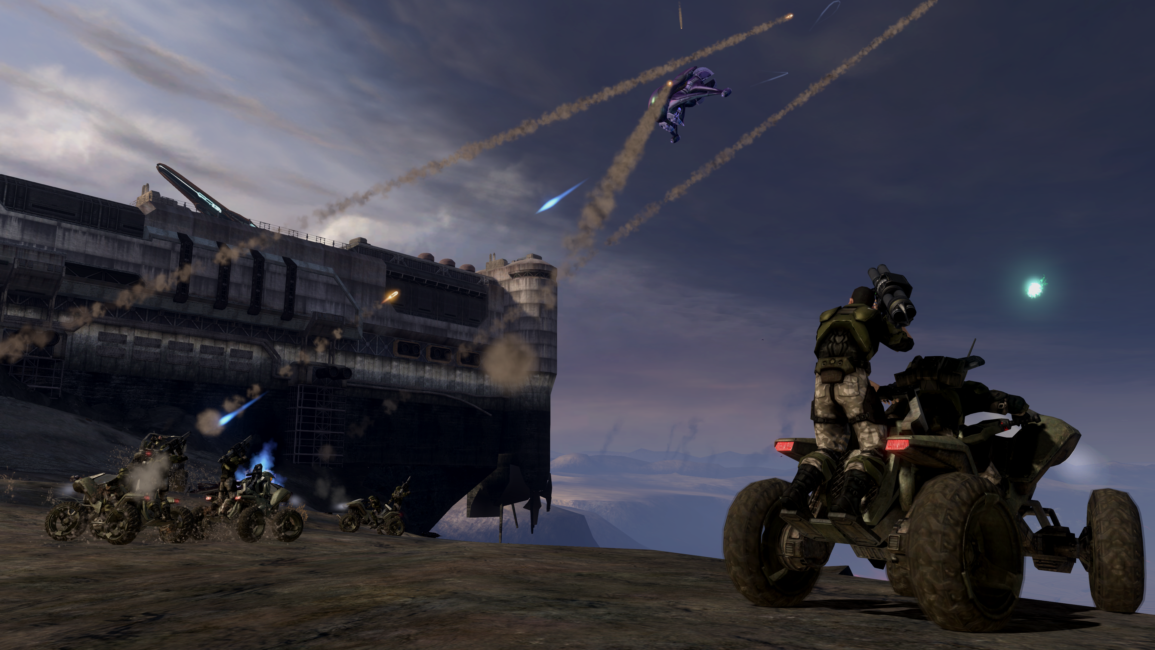 | Summary | Marines on numerous M274 Mongoose firing their M41B SPNKr at a Irdnekt-pattern Banshee during the Battle of Voi. From Halo 3 campaign level The Storm. |