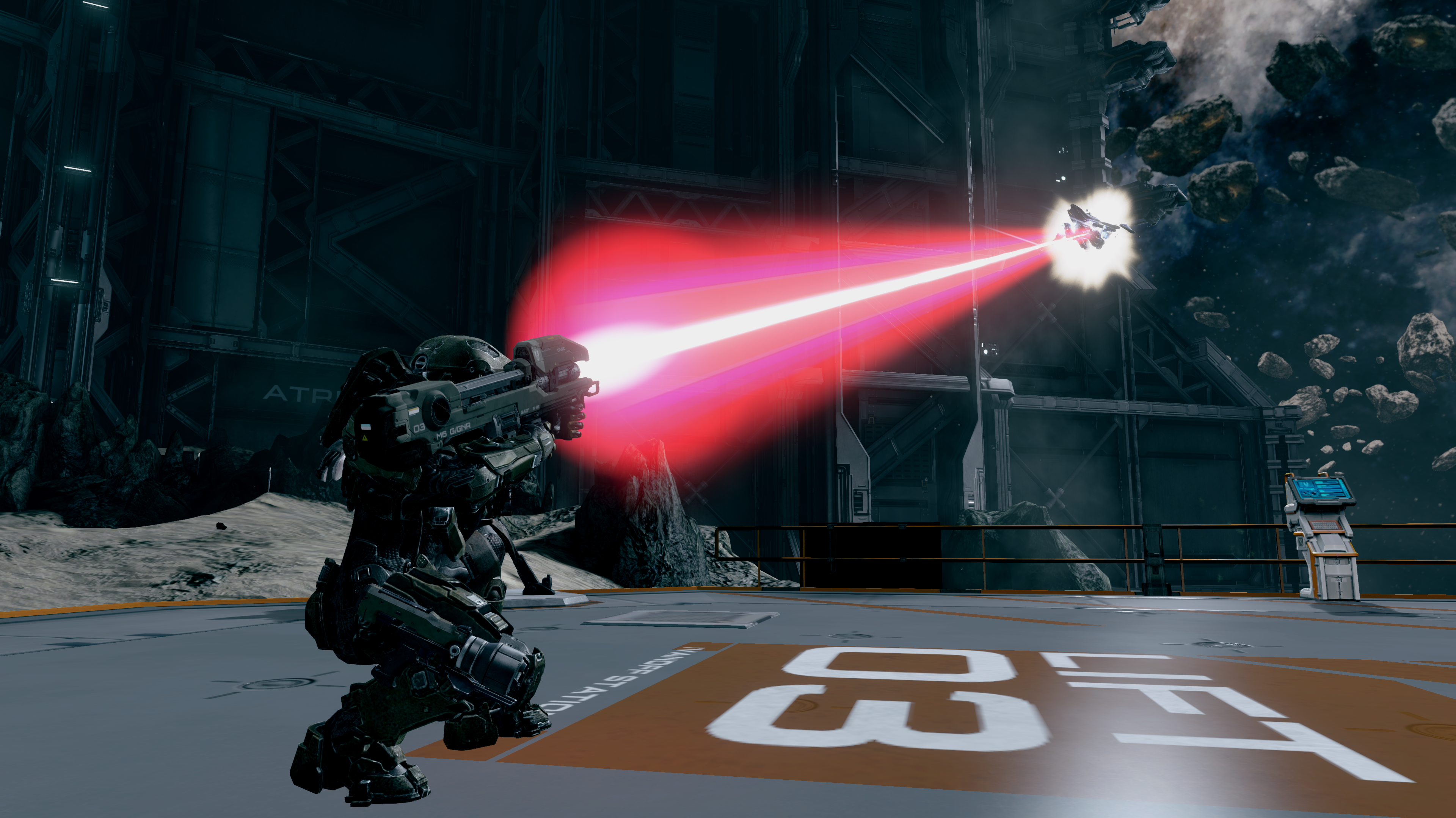 | Summary | John-117 firing an M6/X Spartan Laser at a Is'belox-pattern Bansheeduring the Raid on Ivanoff Station. From Halo 4 campaign level Composer. |