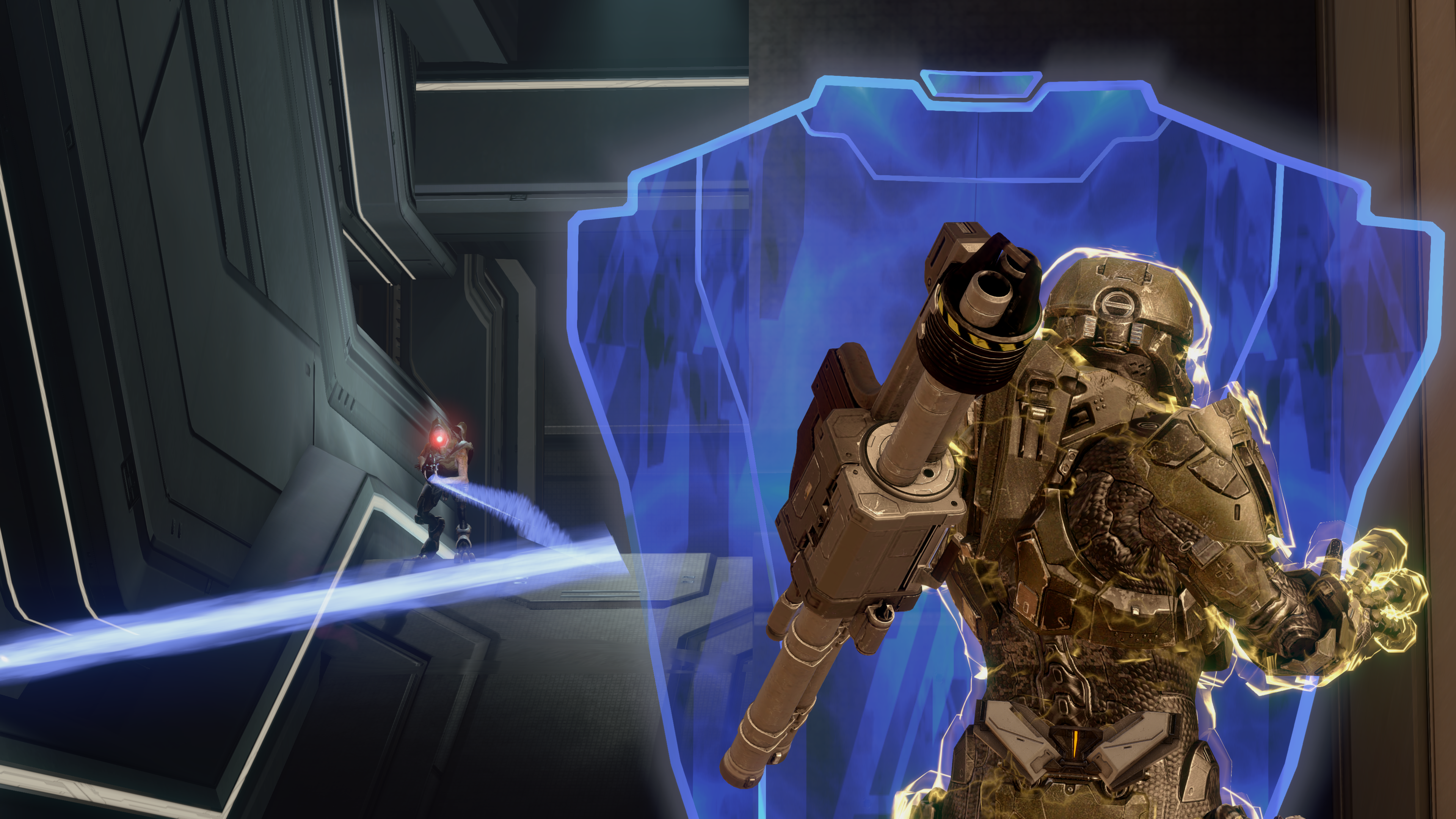 | Summary | John-117's Z-90 hardlight shield deflects fire from a Kig-Yar Sniper's Zubo-pattern beam rifle during the Battle of Requiem. From Halo 4 campaign level Requiem. |