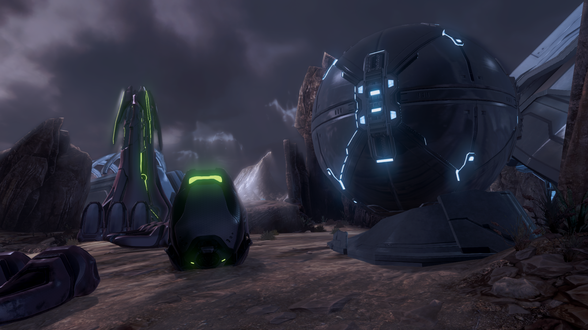 | Summary | A screenshot of a Ra'aam-pattern burst cannon and a Forerunner energy conduit atop a rocky hill in the Spartan Ops level Majestic Rescue. |