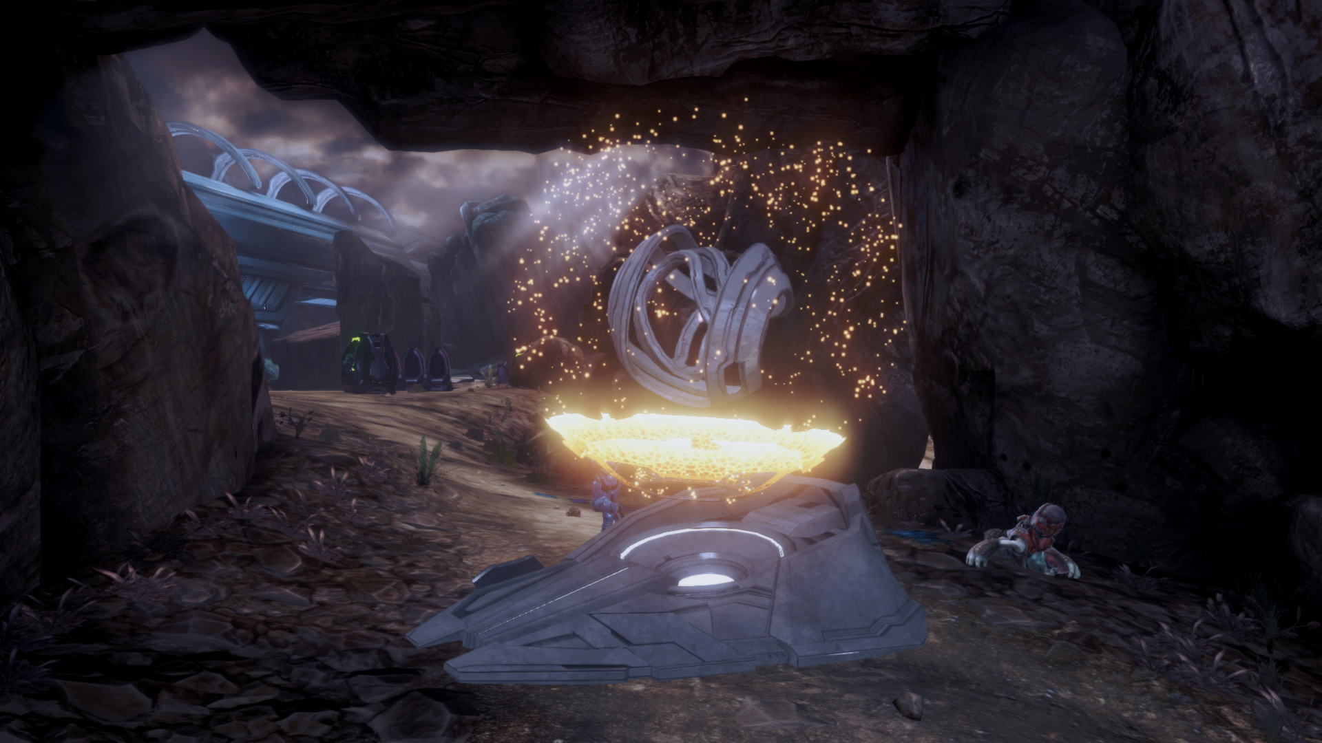 | Summary | A screenshot of a Forerunner energy conduit ablating its smartmatter carapace on the Spartan Ops level Majestic Rescue. |