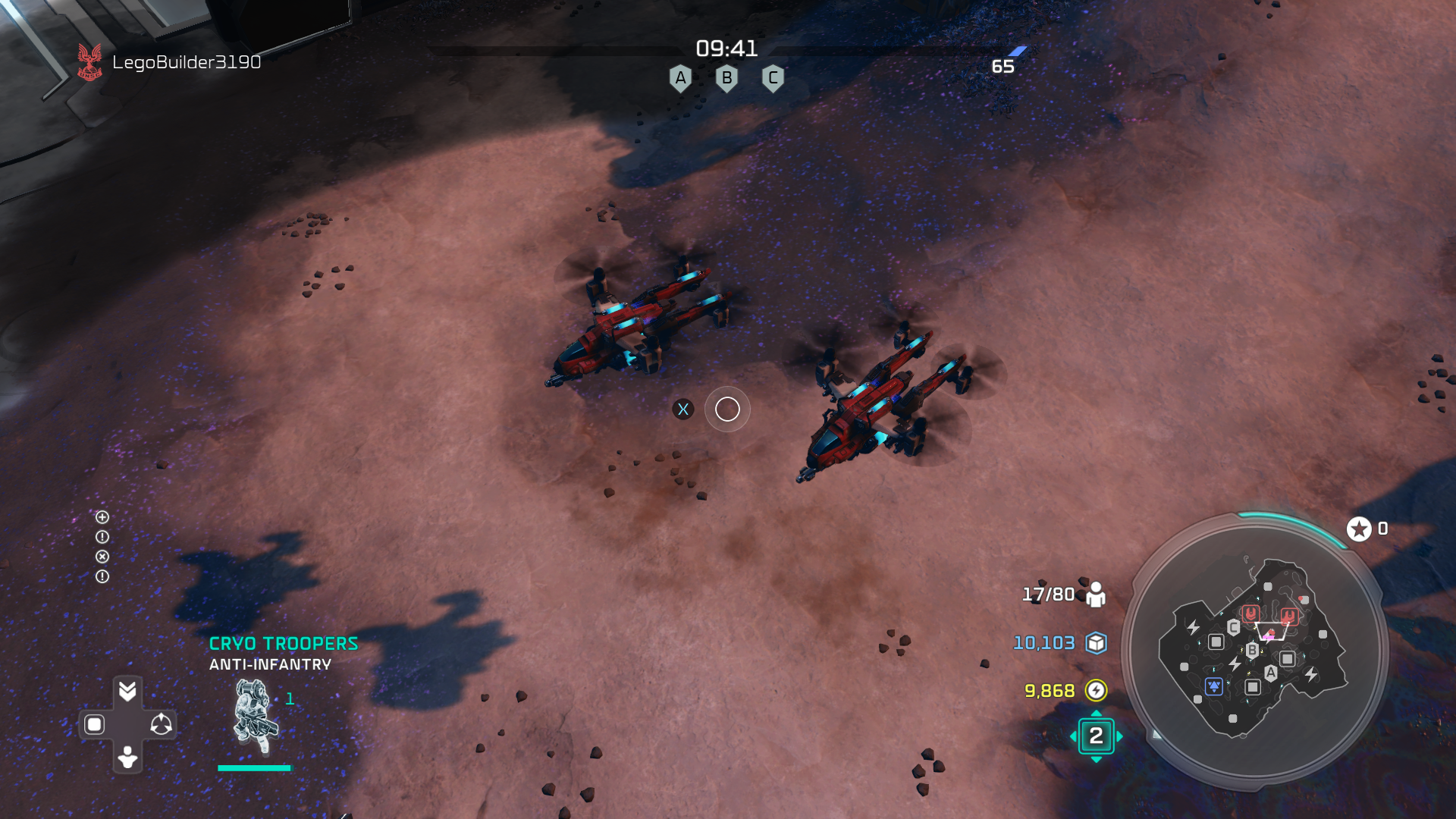 A group of 2 Frostravens in Halo Wars 2 on the multiplayer map "Bedrock".
