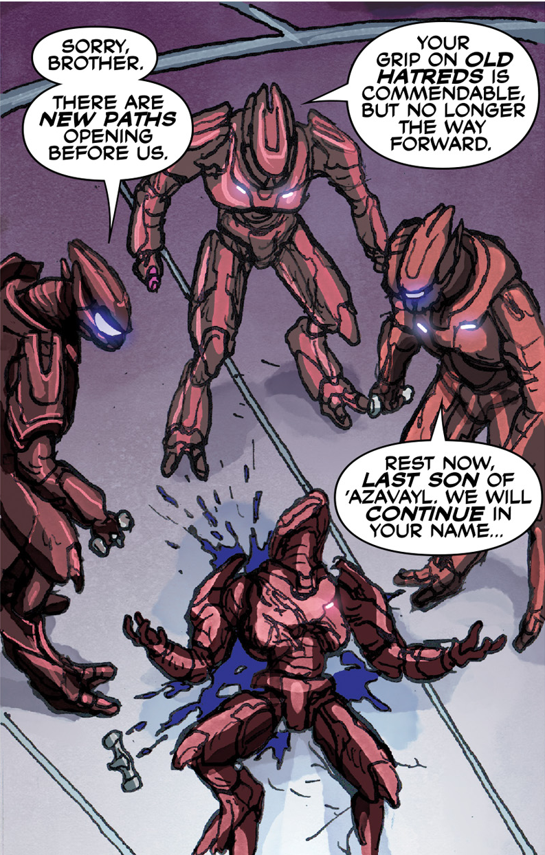 | Summary | Silent Shadow Sangheili troops observing the corpse of Resa 'Azavayl. |