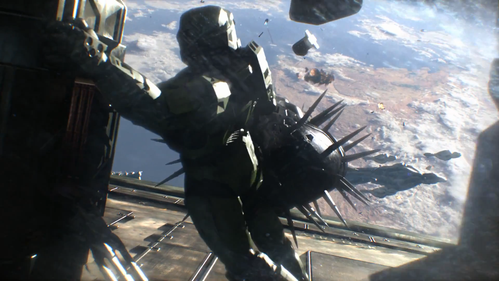John-117 holding onto an antimatter bomb over Earth in the Halo: The Master Chief Collection announcement trailer.