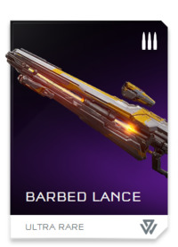 | current | 00:38, July 9, 2016 | 200 × 277 (17 KB) | Rusty-112 (talk | contribs) | Barbed Lance REQ card in ''Halo 5: Guardians'' |