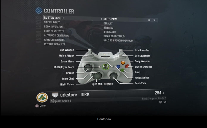 | Summary | Screenshot of "Button Layout" set to "Southpaw" in the Halo Reach menu. |
