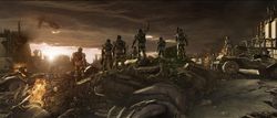 Three Marines fire their weapons. The camera then cuts to a shot of several Pelican dropships arriving with several Warthogs racing through the drop zone. Marines then charge out of one of the landed Pelicans. There is a cut to a Marine hitting an Elite from behind, so that he falls down and is shot dead by another Marine. Then it cuts to a panorama, showing nine Marines cheering and a Warthog overlooking the battlefield; a destroyed city with a burning Sinaris-pattern heavy destroyer in the distant sky, presumably shot down by UNSC forces.