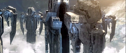 While the Forerunners could effectively commence direct planetary bombardment via their energy weapons, a peculiar Forerunner weapon used during planetary assaults would cut off and lift up an enormous portion of the planet's crust, overturn it, and drop it back down.[17] Single-occupant attack vehicles—some of them classified as forms of battle armor, like war sphinxes or seekers—could be deployed in swarms across continents and had the ability to destroy entire cities.[18] As a more extreme measure, the Forerunners were also capable of artificially inducing premature stellar collapses in the event the Flood overran a star system.[1] To combat the Flood, the Forerunners equipped their starships with a mechanism known as Modular Dispersal Technology, a means to efficiently scuttle sections lost to the Flood while maintaining the integrity of the rest of the ship. This technology was later appropriated for use by the Covenant.[19]