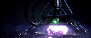 The Chief travels through the conduit — a tube of green energy — at an extremely high speed. The conduit disengages as the Forerunner Dreadnought starts to launch, and John hurtles into the ship through a large portal, landing with scrapes flickering off his armor as a large set of doors closes behind him.