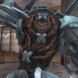 Mgalekgolo usually stand between twelve to thirteen feet tall, but during combat they hunch themselves over to protect their vulnerable neck and midsection, reducing their height to roughly eight feet. They fight using assault cannons integrated directly into their armor, and they carry an enormous two-ton pavise shield made of an alloy derived from the same material that forms Covenant warship hulls.[2] Mgalekgolo body armor is eight centimeters thick, with the shield being even thicker.[21] Their shields and armor protect them from almost every form of plasma-based or ballistic weaponry available to Covenant and human infantry alike, and the shield is a powerful melee tool capable of crushing anything in its path and allowing the Mgalekgolo to neutralize most enemies in close combat. However, their heavy protection is inadequate against dedicated anti-tank weapons, with 102mm HEAT warheads,[22] 105mm recoiless rifles,[23] and 90mm high-velocity tank cannons taking them out with ease.[24] The M149 Magellan 105mm recoiless rifle is even capable of over-penetrating both the pavise and the armor with a delayed fuse round.[25] There are a few weak spots in the armor however, such as the lower back where they are vulnerable to regular weaponry. However, due to their sheer size and speed, it is difficult for enemies to hit these spots. Their arm-mounted shield was the basis for an avenue of UNSC research which produced an early prototype shield of human origin.[26]