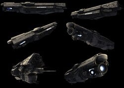 The in-game cinematic model for UNSC Infinity is armed with sixteen Fortress guns arranged in banks of four: eight total guns on the top of the ship, and eight below.[3] These models can be additionally be seen on the high-resolution cinematic model for the ship used in the game's Axis Studios cutscenes.