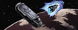 While en route to the frigate, Unrelenting returned to the battle and began to engage Commonwealth, severely damaging the frigate. As the Covenant prepared to finish off the human ship, John had Sam take a team of Spartans to remove the Pelican's Anvil-II AS missiles.[25] With thruster packs, all the Spartans flew out from the Pelican and attempted to direct themselves towards Unrelenting. Sam, Kelly, and John were the only three Spartans who made it onto the ship, gaining access through a hull breach created by a Magnetic Accelerator Cannon round from Commonwealth.[26]