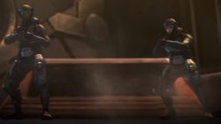 In preparation for the meeting, the combined insurrectionist task force set up an outpost on Seoba, the moon of Biko. The outpost was located in an old abandoned ice quarry, and armed with hundreds of soldiers, several Civet ATVs and a handful of M41 anti-air guns. This outpost was ultimately attacked by the UNSC's Task Force Yama, who had picked the same site as a staging area for their Operation: SILENT STORM - unaware of the rebel presence in the area.[15] The 21st Space Assault Battalion was ultimately able to subdue the rebels, capturing over three hundred - including General Garvin - alive. The prisoners were loaded onto the transport Emmeline, though in the chaos of the ensuing Battle of Biko the transport was intercepted by Tel 'Szatulai.[16] During the meeting, General Garvin provided Tel with schematics for the MJOLNIR Mark IV armour.[17]