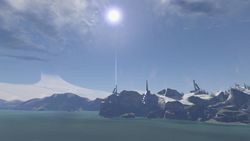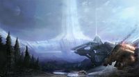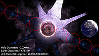 Following the Created takeover of human space on October 28, 2558 the Ark's failsafe measures prevented Cortana and her allies from being able to access the installation.[28] A month later, the Banished, led by the Jiralhanae warlord, Atriox, laid siege on the UNSC bases on Installation 00, among them the Henry Lamb Research Outpost.[29] Shortly after the Banished's attack, the UNSC Spirit of Fire, drifting in space for 28 years, was abruptly transported to the Ark by a mysterious entity. Those on board the Spirit of Fire came into conflict with the forces of the Banished on the surface soon after. During the battle, it was discovered that the Ark had constructed a new replacement Halo, which was launched by Professor Ellen Anders in an effort to deploy it to the Soell system and raise a distress beacon to the UNSC. However, the Halo was intercepted on the way to Soell by a Created Guardian, while the forces of the Spirit of Fire and the Banished remained in conflict on Installation 00.[5] During this time, the Flood, who had survived aboard the ruins of High Charity, were inadvertently released by Voridus and Pavium when they breached the containment shield around the structure with a Scarab and deactivated the Ark's Sentinel defense network in the process. The Flood began a second rampage on the Ark, forming a Proto-Gravemind that quickly began turning into a Gravemind. Voridus and Pavium managed to reactivate the Sentinel defense network and with the help of a Retriever Sentinel, killed the Proto-Gravemind before it could finish its transformation into a Gravemind. With the Proto-Gravemind dead, the Banished and the Ark's Sentinels were able to contain the Flood once again and seal off High Charity.[30] In October 2559, more Banished forces and members of the Keepers of the One Freedom manage to open a Slipspace portal to the Ark from Reach and travel through it. The portal closes behind them, but Veta Lopis and the Ferrets follow them through, sending ONI a message about their actions through Blue Team along with the fact that Atriox's return is expected.[31][32] Design details[edit]Installation 00 resembles a massive flattened dish with a series of eight curved arms, known as spires, four large and four small, arranged around its rim, similar to the petals of a flower. The entire upper surface is terraformed, with oceans, forests and deserts.[9][11] Installation 00 is 127,530 kilometres (79,243 mi) in diameter and thus one of the largest known Forerunner constructs.[4] Spread throughout the installation are hundreds of refugia, artificial biomes designed to sustain diverse flora and fauna as part of the Conservation Measure. Each of these refugia are separated by massive quarantine walls.[6] Twelve refugia are located on the central hub, while an additional twenty are located on the arms of the structure.[33] The various refugia are intended to mimic common planetary environments - one such refugia known as the Halo Refugia[34] bore a notable similarity to Earth's climate, though much more extreme; mountains are higher, chasms are deeper and the sea and sky are a deeper blue.[34] At the center of the installation is the Foundry, an enormous circular facility used to construct Halos. The core of the 10,000-kilometer-wide Foundry is a hollow space, home to a stripped remnant of a material-rich celestial body used to obtain the vast amounts of resources required for the construction of a Halo ring. When active, the Foundry generates so much heat that the Ark requires multiple cooling stations. At least two such systems span a snowy gorge; it is possible that the massive cooling systems caused this icy climate.[35] Like the shield worlds, Installation 00 possesses an artificial sun.[9][11][12] Like the Halos, Installation 00 features multiple Cartographer facilities, map rooms that can pinpoint any location on the installation.[9][36][37] Similarly to the Halos, the Ark features a control room from which the array could be activated. This facility, known as the citadel, is protected by a system of energy shield barriers that encircle the center of the disk. These barriers are controlled by towers that circumscribe the center of the installation.[11] The Ark also possesses a vast network of power grids beneath its surface. These grids can be tapped into by structures on the surface known as Power Nodes when extra locational power is needed in emergencies. These nodes were co-opted by UNSC and Banished forces in 2559, though Banished Power Extractors were also able to tap into these power networks.[38][39] Defenses[edit]Similar to most Forerunner installations, the Ark had its own monitor, 000 Tragic Solitude, charged with the facility's defenses. For the most part, Solitude reacted little when humanity and the Covenant arrived at the Ark, though when 343 Guilty Spark attempted to access the Ark's systems during the Battle of Installation 00, Tragic Solitude threatened to add the monitor to the facility's targeting ledger if he persisted.[40] After the Ark was severely damaged by the destruction of Installation 08, the latest on a line of destroyed Forerunner relics, Solitude grew bitter and viewed all sentients in the galaxy as incapable of being peaceful.[23] The arrival of the Human-Covenant War to the installation additionally prompted the activation of Terminus', structures that are designed to perform tireless cataloging, recording of indexing of events in an attempt to prepare countermeasures and defences for future possible scenarios. These records are cross-references with existing records of historical events and battles to perform simulations and predictions of potential outcomes - losing a terminus would result in a massive loss of operational capability for the installation.[41] The Ark's small defenses were Aggressor Sentinels created by numerous Sentinel factories just like at the rings. The Retriever Sentinels could also be used offensively, though they were not usually ou