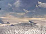 In 2555, the Ark was partially restored and Tragic Solitude enacted its plan. Using Kodiak to activate the process, Tragic Solitude initiated a countdown to the rings' firing in several weeks. This was so that someone within the Milky Way galaxy would open a portal to the Ark in an attempt to stop the countdown, allowing the monitor to dispatch its Retriever Sentinels to kill all sentient species and mine their planets to repair the Ark. The countdown was discovered on the intact Halo rings soon after and a human-Sangheili joint task force departed to the Ark through the Portal at Voi. The expedition's ship was intercepted and brought down above the Ark by Tragic Solitude's Retrievers, but the crew survived and managed to reach the Array's control center and stop the countdown. However, the portal was still open and Tragic Solitude deployed a fleet of Retrievers to Earth in an attempt to mine the Sol system's worlds, causing heavy damage to the region surrounding the portal as well as the UNSC Home Fleet. However, the UNSC-Sangheili crew managed to thwart the monitor's plan and the Retrievers were recalled, with the monitor ending up destroyed. UNSC reinforcements were deployed through the portal to the Ark soon after and rescued the expeditionary crew. With Solitude destroyed and the Retrievers now dormant, the UNSC began to establish research facilities on the Ark and study the Sentinels in hopes that they could be commanded to continue repairing the installation by strip-mining lifeless systems so that no one would be harmed in the process.[23] Repairing the Ark and research[edit]In 2557, a human research team traveled to the Ark aboard Eden Rising to establish a permanent base on the Ark, the Henry Lamb Research Outpost. The scientists reactivated the dormant Retriever Sentinels which were dispatched to lifeless systems to strip-mine them for the needed resources and under the guidance of the Smart AI Isabel, began nudging along repair efforts.[24] However, over time, the process became fully automated and the scientists could simply sit back and watch the wonder of a world being reborn.[25] Within three months of the establishment of the Henry Lamb Research Outpost, there would be a new shift in the outpost's surroundings as the Sentinels repaired and rebuilt the Ark. Dense forests sprang up from pit-black, barren terrain over the course of a week and archeologist Nathaniel Palmer monitored a particularly virulent strain of weed that was checked by the reintroduction of voracious, insectoid parasites before it could strangle the budding plants nearby.[26] The Ark showed itself to be remarkably adaptable to change, with Palmer witnessing as giant tectonic plates rearranged, shifted and unfolded to form a new pathway across a chasm.[27] New arrivals[edit]Captain James Cutter and Dr. Ellen Anders survey the Ark from high above it.