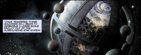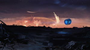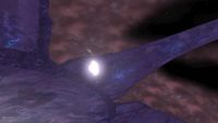 Immediately following the Prophet of Regret's botched invasion of Earth on October 20, 2552, the Prophet of Truth dispatched a Jiralhanae-led fleet to continue the assault and to uncover what he believed to be the Ark. By November 17, the Covenant had uncovered the structure they had spent the last month unearthing. Truth, through his Forerunner Dreadnought, activated the device, which was actually just a portal-generating structure which led to Installation 00. Truth led his fleet through the portal; after defeating a Flood invasion of the town of Voi, a joint United Nations Space Command - Sangheili strike force followed the Prophet's forces.[18] Upon their arrival on December 11,[1] the latter force were attacked by the Covenant, which held a 3:1 numerical advantage.[9] Despite this, the Sangheili Fleet of Retribution crushed Truth's forces. After engaging the Covenant across the installation, Spartan John-117 and Arbiter Thel 'Vadam entered the citadel, where they found Truth, who had become infected by the Flood and deactivated the array. Soon after 'Vadam killed the Prophet, effectively destroying the Covenant and ending the war, he, the Master Chief, and 343 Guilty Spark, the former monitor of Installation 04, discovered that a replacement Installation 04 was being constructed by the Ark's Foundry.[11] The Spartan and the Arbiter soon rescued the AI Cortana, who held Installation 04's Activation Index, from the Flood-infested Covenant capital city, High Charity.[19] They, with Sergeant Major Avery Johnson, assaulted the Halo's Control Room to activate the ring, destroying both the Flood and the remaining Covenant forces. They succeeded, though Johnson was killed by the monitor. While Guilty Spark refused to allow his new Halo to be destroyed, he also implied that he was protecting the Ark. The partially constructed installation's activation tore the ring apart and severely damaged the Ark.[2][3][12] Post-battle[edit]In March 2553, the Office of Naval Intelligence deployed an automated probe-carrying spacecraft to the damaged Ark using advanced slipspace technology. The ship arrived in November and dispersed its probes, although all communications with the devices were cut off after initial transmissions confirming the Ark's survival. In response, the UNSC Rubicon was sent from Luna in December 2553 to conduct a more thorough investigation of the installation's ravaged surface.[20] Due to the damage dealt to the Ark's life support systems and its artificial sun, heavily inclement weather became the norm.[21] The UNSC Rubicon carried several remote contact teams, who landed on the damaged Ark and attempted to find the source of the mysterious signal. After about eight days, contact with all teams was lost; only one team, RCT-06, returned, having sustained heavy casualties and carrying with them a device of unknown nature. The armature's origin was subjected to debate, but it was believed by the team to be the source of the beacon picked up by the initial investigative group.[21] The device, actually a broken, barely active monitor, began to relate its past life as a human: Chakas. Though the ship's ONI attaché initially doubted the veracity of the monitor's account, the science team leader pointed out that it was consistent with the "Bornstellar Relation" found on Onyx. Eventually, the monitor revealed that it was none other than 343 Guilty Spark himself. Claiming that he knew the location of the Librarian, whom he believed to be alive, Spark subsumed the ship's AI, knocked out the crew via the life support systems, and hijacked the ship.[22] Communications with the Rubicon halted within 48 hours of its last report. Search and rescue teams were then deployed to the site, but reported no findings.[21] The last of its ground team, Bobby Kodiak, was left stranded when the Rubicon left, and mortally wounded by attacking chaefka. It was then that he was contacted by the Ark's monitor, 000 Tragic Solitude, who had survived the Ark's devastation and sought to repair the station and get revenge. Offering him a chance to live, Tragic Solitude rescued Kodiak and mended his body with cybernetics, turning him into a cyborg and putting him under the monitor's control. For the following two years, Tragic Solitude partially repaired the Ark and prepared for an attack on the galaxy. Tragic Solitude was able to repair the Ark end of the Portal at Voi and increase its power so that the portal would transport objects near-instantaneously between Earth and the Ark, but he couldn't activate the portal as the firing of Installation 08 had severed the monitor's control over it.[23] Operation: FAR STORM[edit]